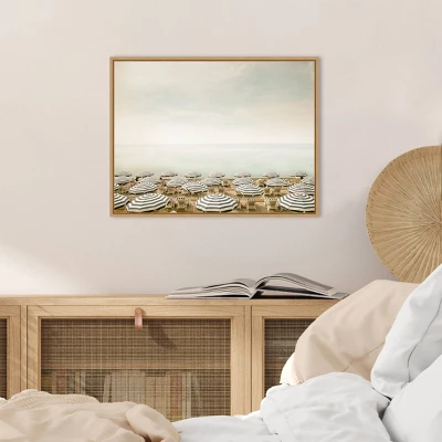 ART DESCRIPTION: The pale aqua color of a still and peaceful sea is contrasted by multiple rows of navy and white beach umbrellas and lounge chairs spread out across the sand. Sunbathers can be seen taking advantage of the sunny day. This Amanti Art canvas art print was created by Carina Okula and printed by Amanti Art in Madison WI. The canvas is stretched by hand and finished with a float frame. Individually made using traditional custom framing techniques, it has the quality you would expect from your local frame shop. Because of our attention to detail and focus on artistry, architects, interior designers, and homeowners alike choose this framed canvas artwork to create beautiful living spaces.